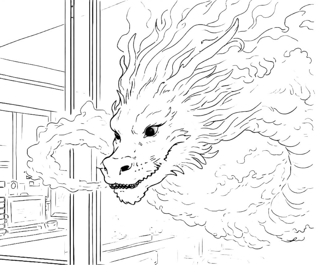 Je me souviens d’un dragon, vaporeux, presque cotonneux, qui se matérialise au-dessus de l’îlot des soignants. Sa tête traverse la vitre et se place juste au-dessus de moi. Je sais qu’il n’est pas réel. Et pourtant, sa présence me rassure.